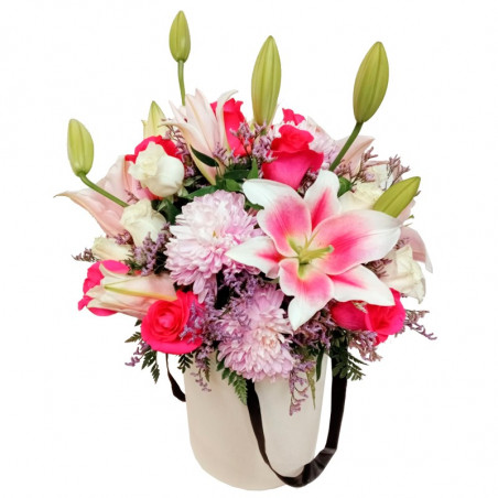 Magestuosa sombrerera de flores en tonos malvas, blancos, rosas y fucsias, compuesta por lililum, rosas, anastasias, etc.