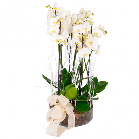 Composición presentada sobre plato de cristal compuesto de 3 plantas de orquídeas phalaenopsis blancas y ramas decorativas, ornamentado con musgo y corteza de pino.